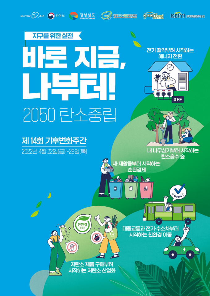 [경남도민뉴스] 경상남도는 ‘지구의 날’ 52주년을 기념하여 기후위기의 심각성을 인식하고 탄소중립 생활 실천 도민 참여를 확산하기 위하여 4월 22일부터 28일까지 ‘제14회 기후변화주간’을 운영한다.