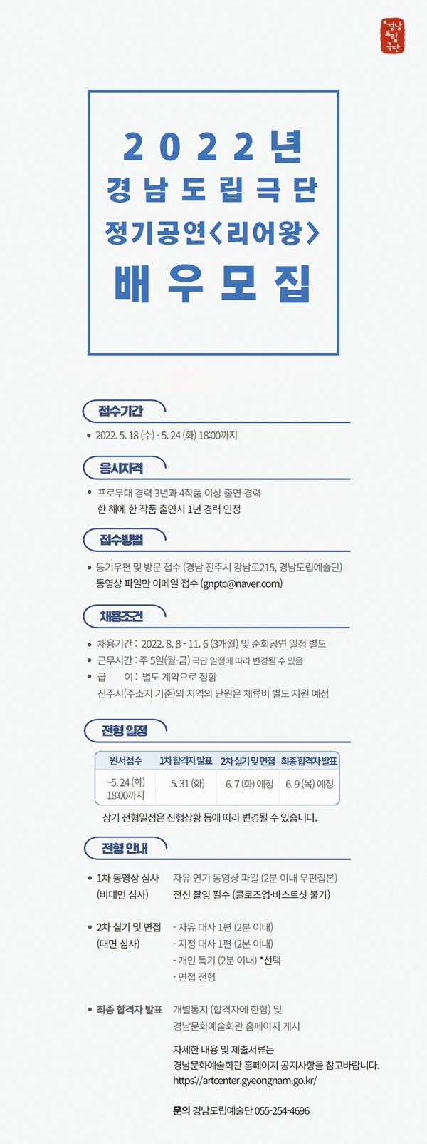 [경남도민뉴스] 경남도립극단이 ‘리어왕’에 출연할 배우를 공개모집한다.