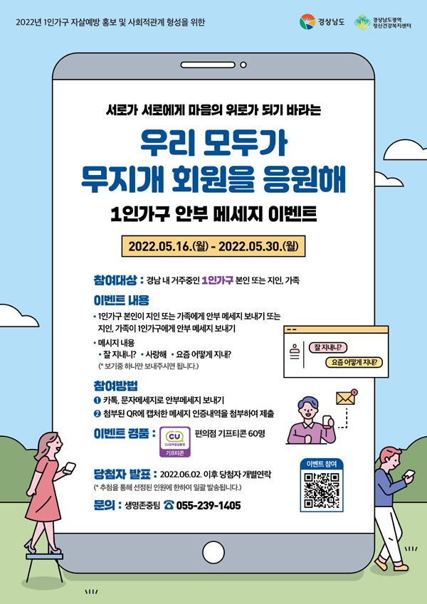 5월 30일까지 진행되는 이벤트에는 경남도 내 거주 중인 1인 가구 본인 또는 가족, 지인 등이 참여할 수 있으며 안부 메시지 보내기를 인증한 참여자 중 추첨을 통하여 60명에게 5,000원 상당의 편의점 기프티콘을 증정할 예정이다.