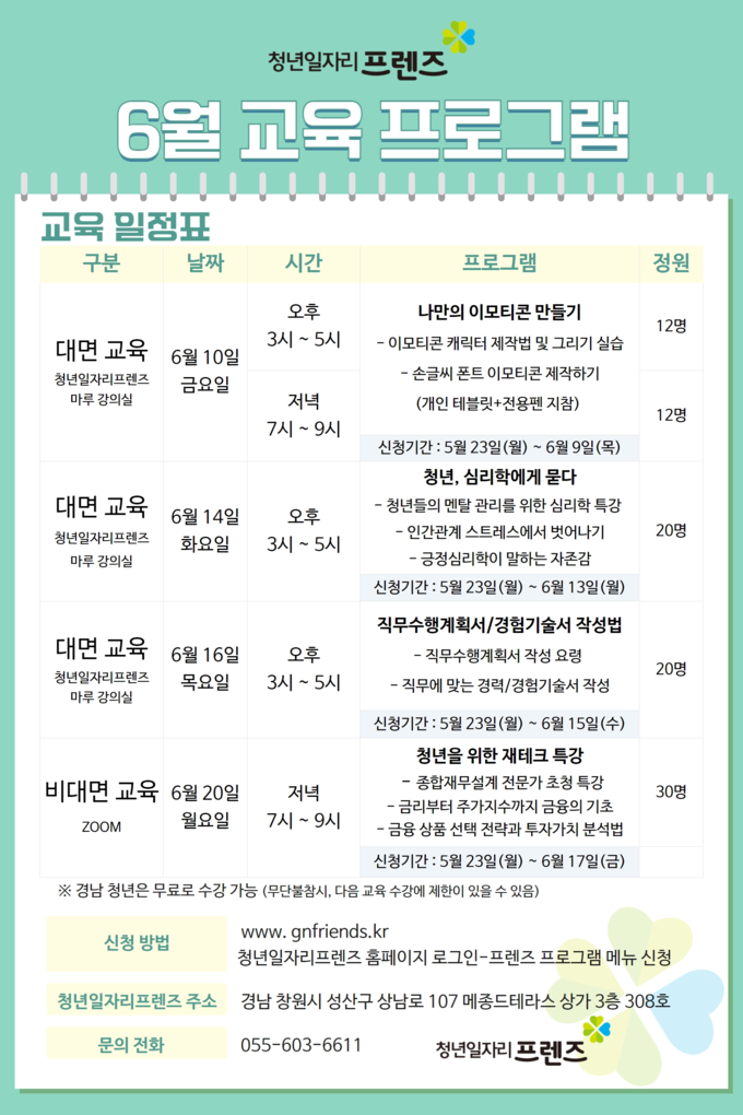 교육프로그램은 나만의 이모티콘 만들기(창업)를 시작으로 직무수행계획서 작성법(취업), 청년 대상 심리학 특강(마음건강), 청년이 꼭 알아야 할 재테크 특강(투자) 등 다양한 내용으로 구성하였으며, 이를 통해 경남 청년들의 취‧창업 역량 강화와 경쟁력 향상을 도모할 계획이다.