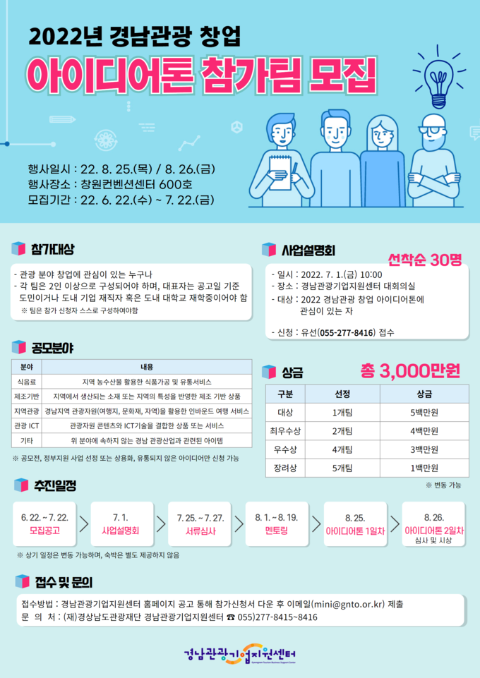 [경남도민뉴스] 경상남도와 경남관광재단은 6월 22일부터 7월 22일까지 2022년 경남관광 창업 아이디어톤* 대회 공모를 실시하고 신청을 접수한다고 밝혔다.