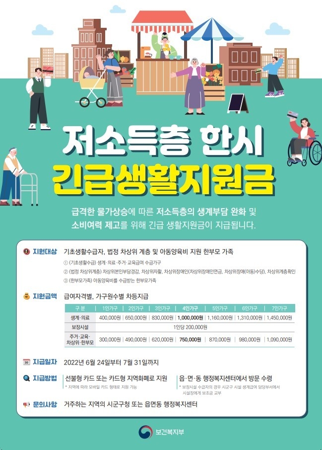 저소득층 한시 긴급생활지원금은 급여 자격과 가구원 수에 따라 최소 30만 원부터 최대 145만 원까지 선불형카드로 1회 지급된다. 별도의 신청 없이 주소지 읍면동 행정복지센터를 방문하면 선불형 카드로 지급받을 수 있다.