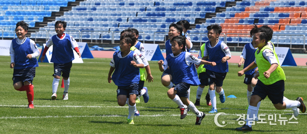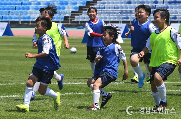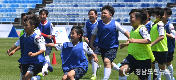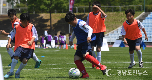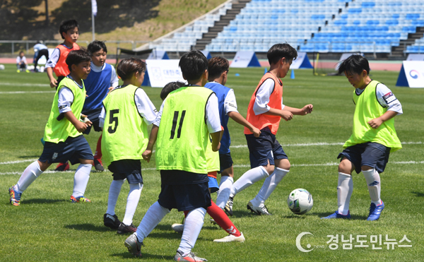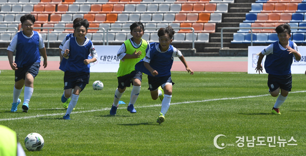 [경남도민뉴스] 무더위가 기승을 부린 2일 경남 거창군 거창읍 거창스포츠파크 종합운동장에서 농산어촌 유청소년 선진 축구체험 참가 선수들이 대한축구협회(KFA) 전임 및 지역지도자 지도하에 기본기 훈련 등 프로그램을 체험하고 있다.