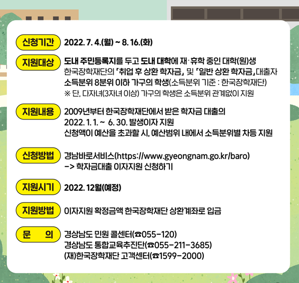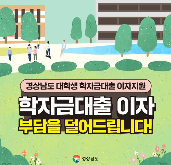 이자 지원은 오는 8월 16일까지 신청할 수 있으며, 경남바로서비스(https://baro.gyeongnam.go.kr)에서 주민등록등본, 재‧휴학증명서 등 필요 서류를 첨부해 본인이 직접 신청하면 된다.