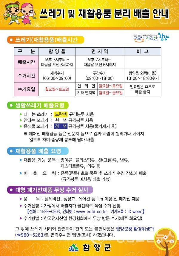 함양군의 쓰레기 배출시간은 오후 7시부터 다음날 오전 6시까지며 일요일을 제외한 새벽 시간대인 오전 6시부터 9시까지 수거가 이뤄진다. 타는 쓰레기 노란색 규격봉투에, 안타는 쓰레기는 흰색 봉투, 그리고 음식물 쓰레기는 물기 제거 후 배출해야 하며 재활용품은 종이·플라스틱·캔·병류·페스티로폼·의류 등을 품목 별로 묶은 후 수집 장소에 배출하면 된다.