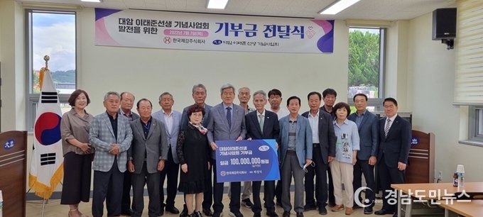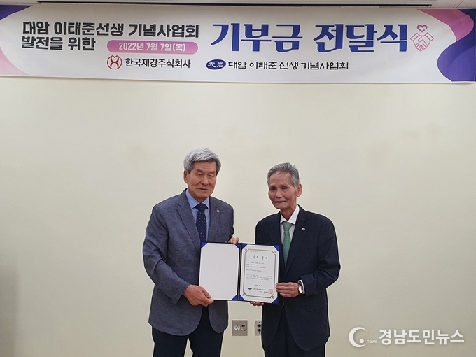 [경남도민뉴스] 한국제강 주식회사 하성식 회장은 사단법인 대암 이태준 선생 기념사업회에 기념사업회 발전과 선생의 선양사업을 위한 기부금 일억원을 기탁하는 전달식을 기념사업회 이사들과 관계자들이 참석한 가운데 2022년 7월 7일 대암 이태준 기념관에서 가졌다.