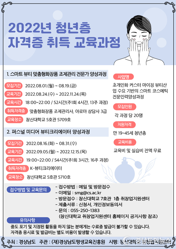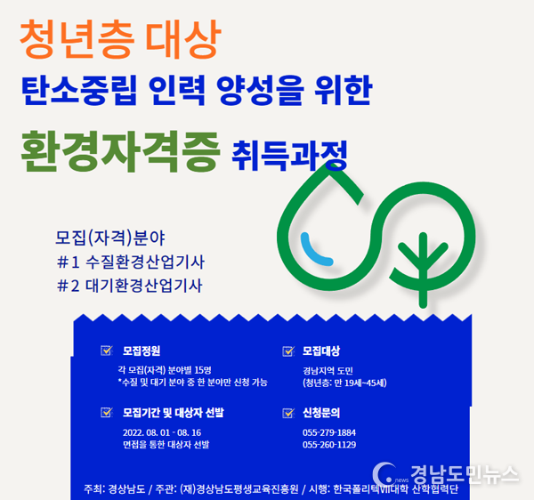 [경남도민뉴스] 경상남도와 (재)경남평생교육진흥원(이하 ‘진흥원’)이 경남도 내 주소를 둔 청년층(만19~45세)을 대상으로 취업을 위한 자격증 취득과정에 참여할 교육생을 모집한다.