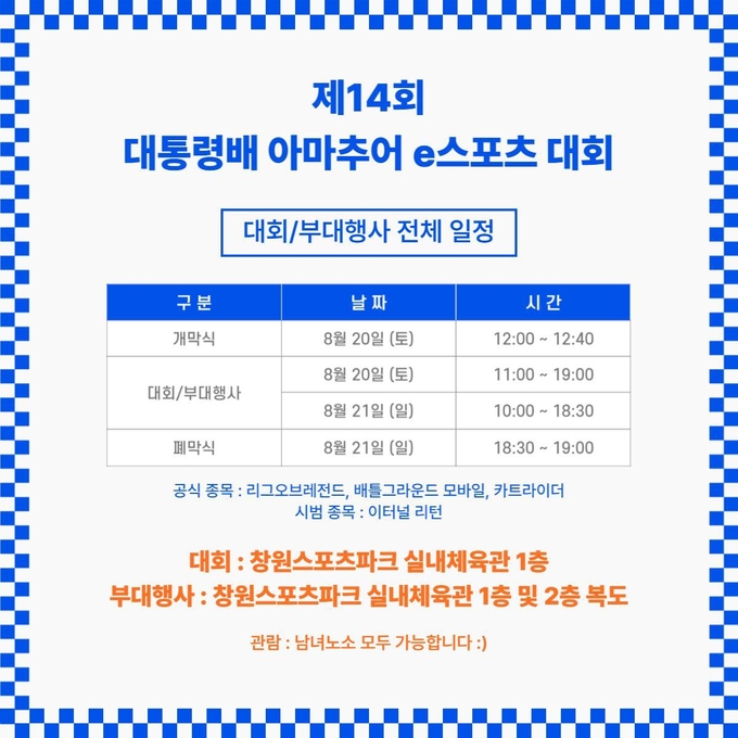[경남도민뉴스] 전국 아마추어 이스포츠 선수들이 기량을 겨루는 ‘제14회 대통령배 아마추어 e스포츠 대회’ 본선이 8월 20일부터 21일까지 창원스포츠파크 내 창원체육관에서 개최된다.