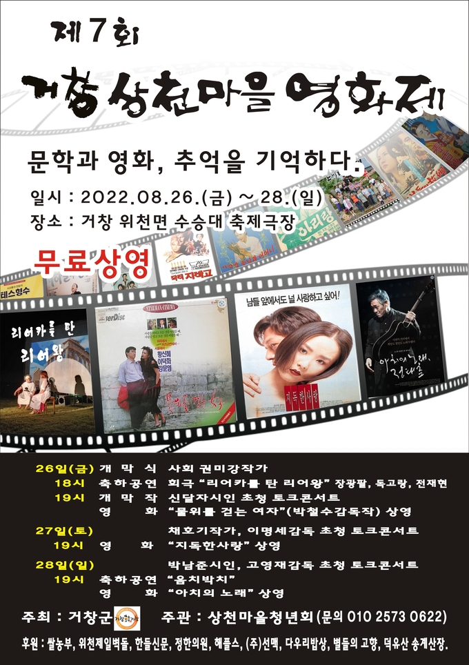 제7회 거창상천영화제 주제는 ‘문학과 영화, 추억을 기억하다’로 문학작품으로 만들어진 3편의 영화를 상영하고 작가와 감독을 직접 만나 작품 전반에 대해 이야기를 나누는 토크쇼로 진행된다.