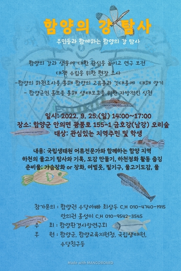 함양군 안의면 금호강(남강) 오리숲에서 물고기 조사와 탐사 도감그리기 하천주변 쓰레기 줍기도 함께 진행한다.