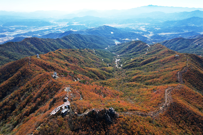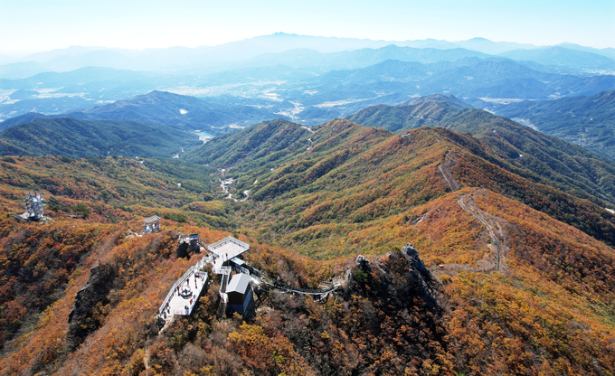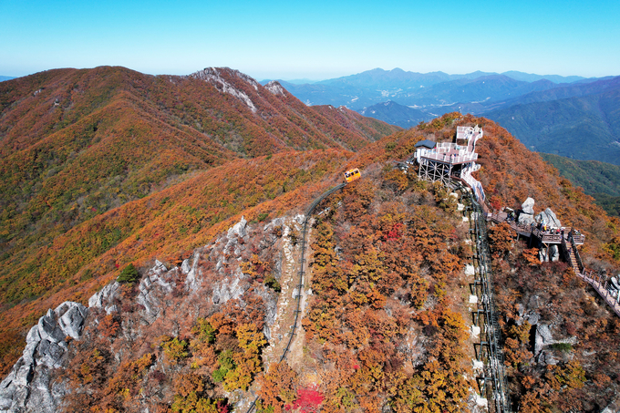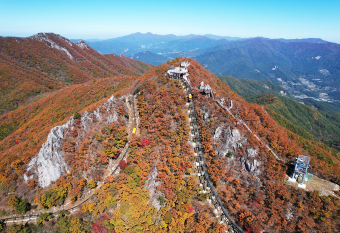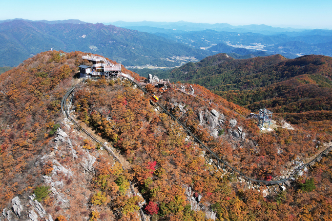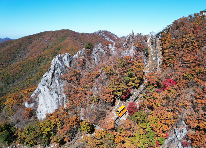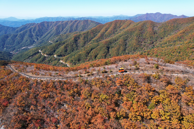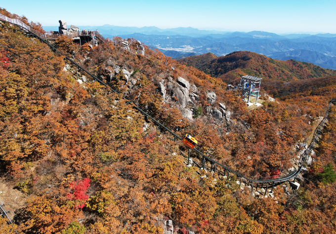 [경남도민뉴스] 청명한 가을날씨를 보인 19일 경남 함양군 병곡면 대봉산휴양밸리를 찾은 관광객들이 모노레일을 타며 물들어 가는 단풍을 구경하고 있다.
