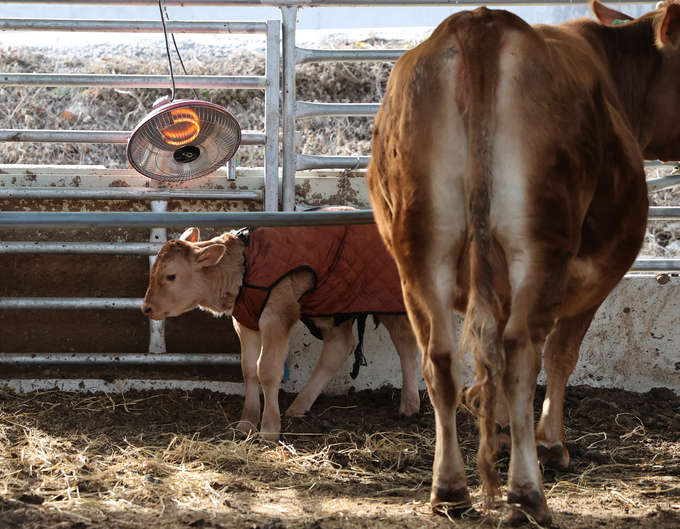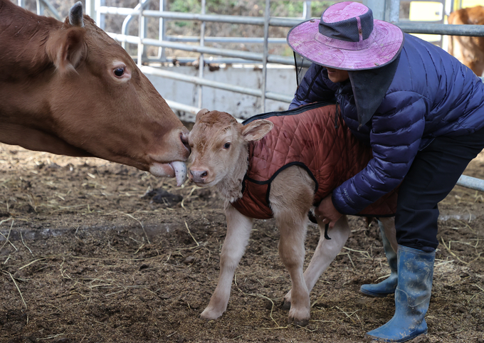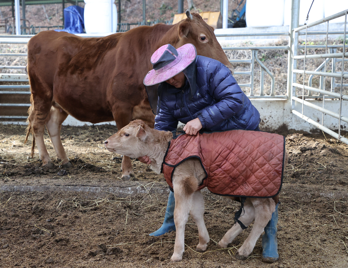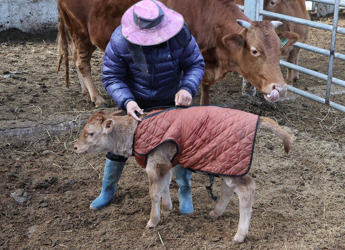 [경남도민뉴스] 한파주의보가 발효중인 30일 경남 함양군 휴전면 한우농장에서 유강현씨가 갓 태어난 송아지에게 방한복을 입히고 있다