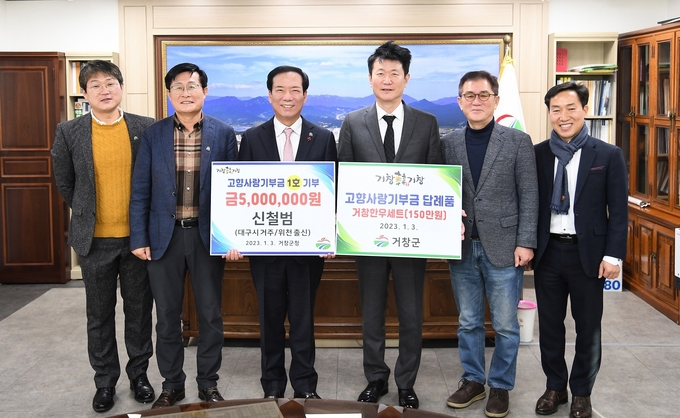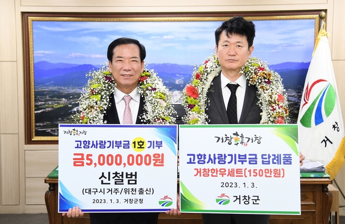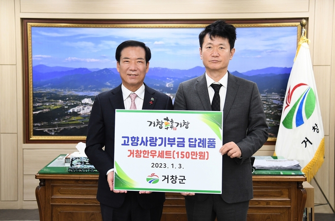 1호 기부자는 대구광역시에 거주하고 있는 전국거창향우연합회장인 ㈜화성E&A와 금강엘이디제작소의 신철범 대표이며, 개인이 기부할 수 있는 최대 금액인 500만원을 기부해 답례품으로 선택한 150만원의 한우세트와 함께 향후 90만8500원의 세액 공제도 받을 수 있다.