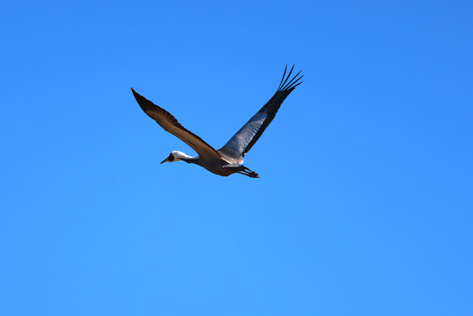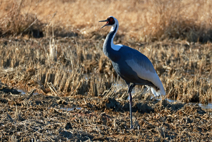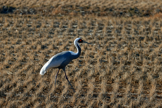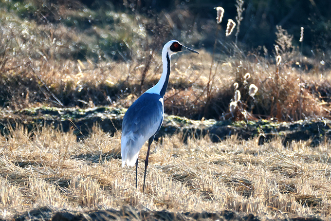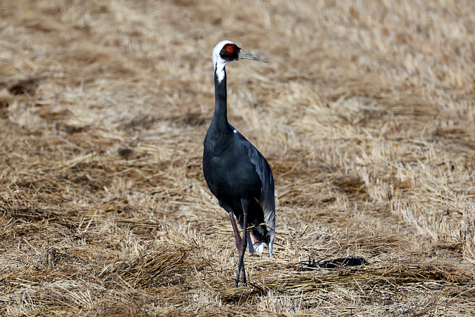 두루미과에 속하는 재두루미는 정수리에서 뒷목까지가 흰색으로 ‘흰목덜미두루미’라고도 불리며 눈 주변은 붉은 피부가 노출되어 있는 것이 특징이다.