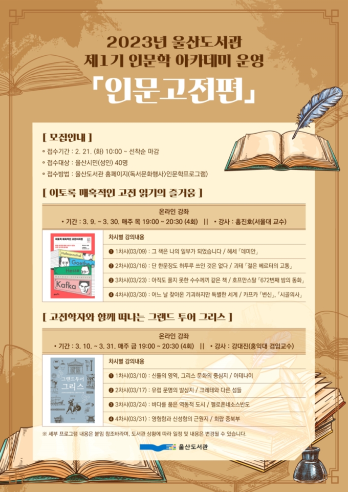 수강 신청은 2월 21일 오전 10시부터 울산도서관 누리집(library.ulsan.go.kr)을 통해 선착순 40명 접수하며, 자세한 사항은 도서관 누리집에서 확인할 수 있다.