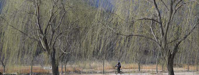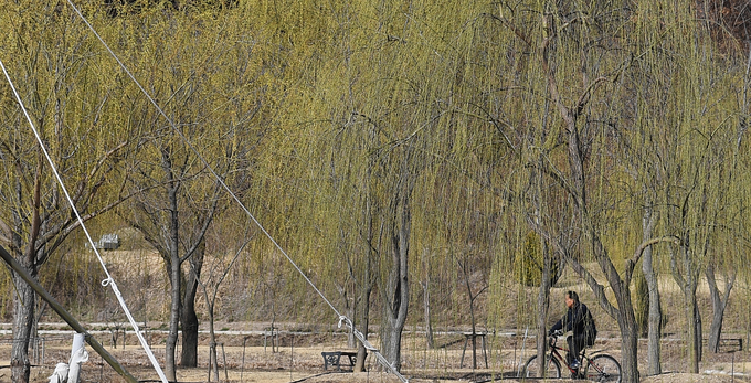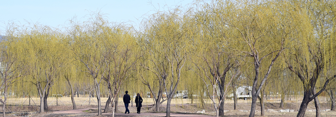 [경남도민뉴스] 16일 경남 거창군 거창창포원에 심어진 버드나무 가지의 노란 연두빛의 싹이 나오면서 봄기운이 물씬 풍기고 있다.