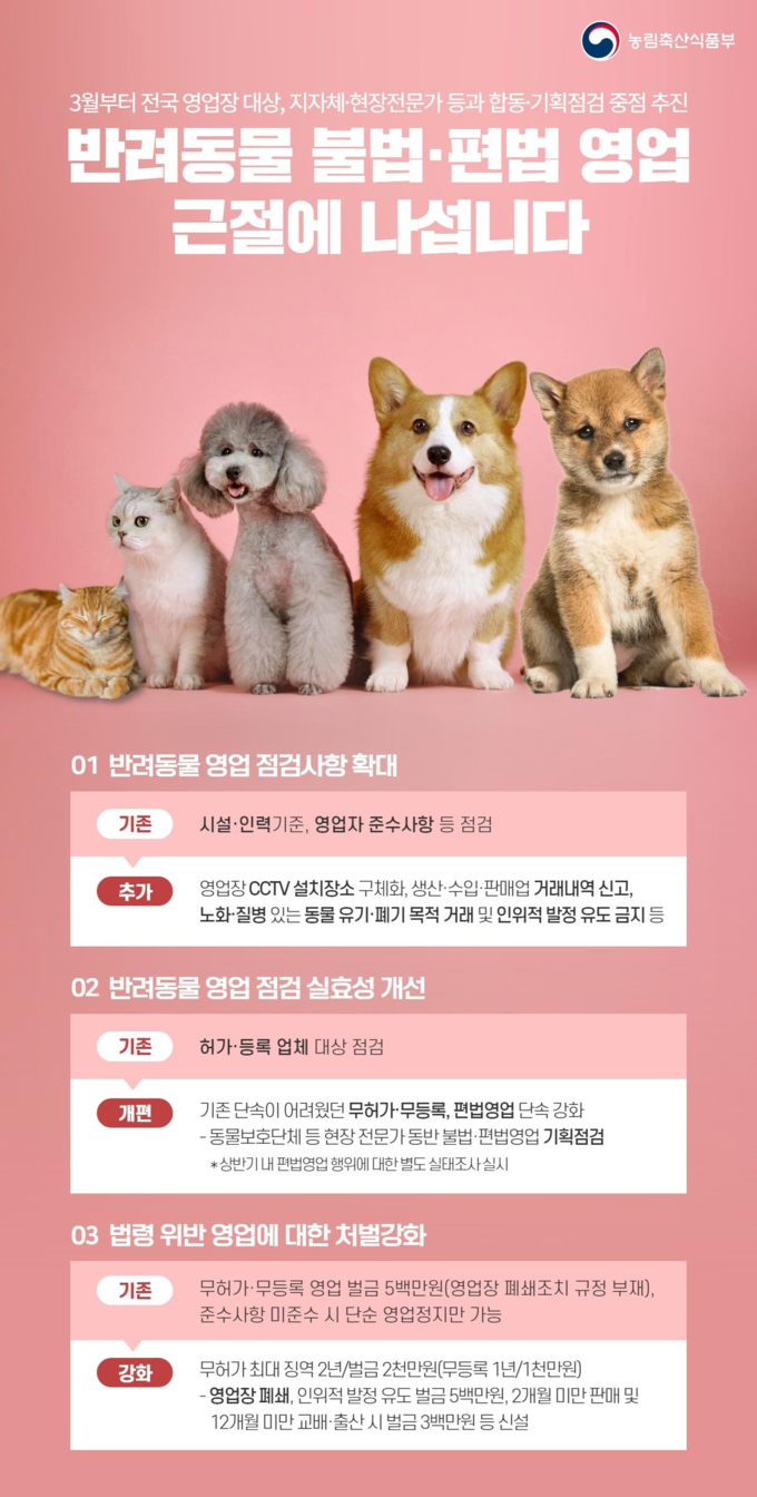 또한 반려동물 영업자 주요 처벌기준이 강화되어 무등록·무허가 영업자에 대한 벌칙조항 확대와 영업자 준수사항 위반 시 과태료 부과하는 등 강화된 처벌 규정이 마련되었다.