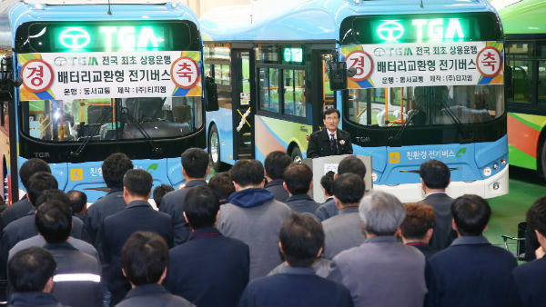 함양군 함양일반산업단지내 ㈜티지엠 현장에서 세계최초 무인자동 배터리 교환식 친환경 전기버스 출고식을 4일 거행 했다.