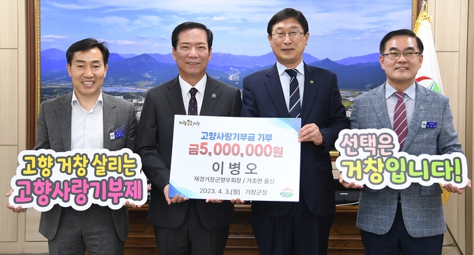 거창군은 3일 이병오 재경거창군향우회 회장이 고향사랑기부제 기부 최고 금액인 500만 원을 군에 기부했다고 밝혔다.