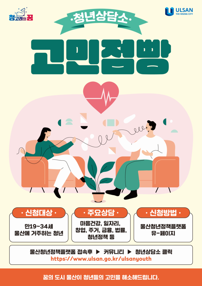 참여를 희망하는 청년은 울산청년정책플랫폼 유-페이지(www.ulsan.go.kr/ulsanyouth) 청년상담소(고민점빵)로 신청하면 된다.