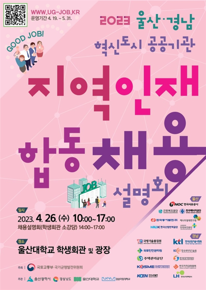 [경남도민뉴스] 울산시는 4월 26일 오전 10시 울산대학교 학생회관에서 ‘2023년 울산경남 혁신도시 공공기관 지역인재 합동채용설명회’를 개최한다고 밝혔다.