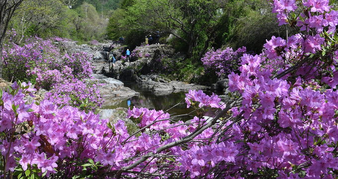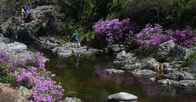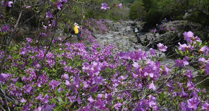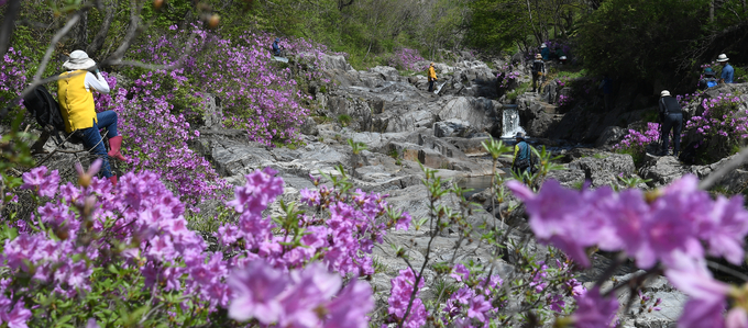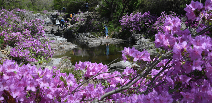 [경남도민뉴스] 20일 남덕유산 자락인 경남 거창군 북상면 월성계곡에 흐드러지게 핀 수달래와 계곡수의 흐름을 담으려는 사진작가들의 발길이 끊이지 않고 있다.