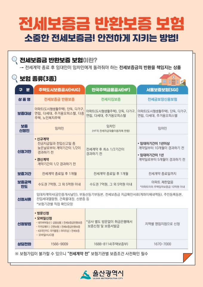 울산시 관계자는 “소중한 전세보증금을 안전하게 지킬 수 있는 방법은 사전 예방이 최선이라며, ‘주택임대차 안심계약 상담센터’ 상담을 통해 위험성을 줄이고 안전하게 임대차 계약할 것을 당부드린다.”라고 말했다.