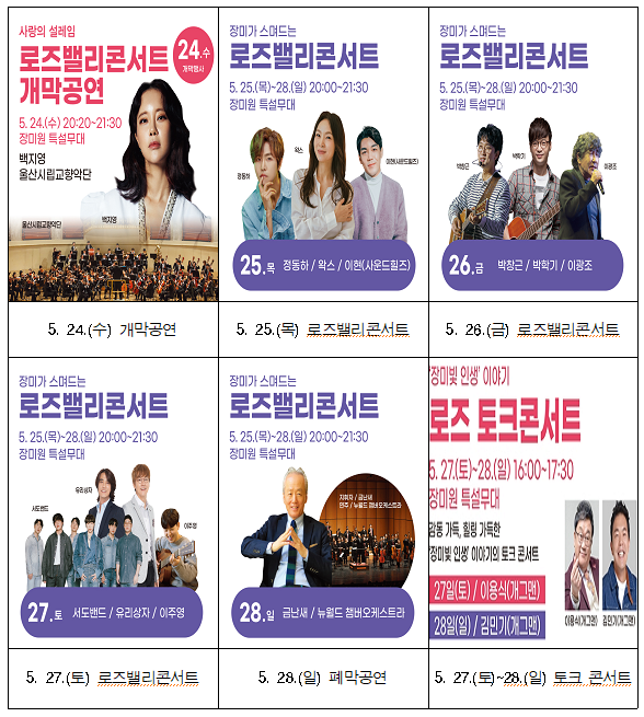 이어 25일부터 28일까지 국내 정상급 가수들이 참여하는 ▲장미계곡 공연(로즈밸리 콘서트), 지역문화예술인의 열린무대 ▲사랑의 노래 공연(러브뮤직 콘서트), 연령대별 공감할 수 있는 주제의 강연 ▲장미 이야기 마당(로즈 토크 콘서트)과 거리공연(버스킹) 등 크고 작은 프로그램이 축제 분위기를 한껏 끌어올릴 전망이다.