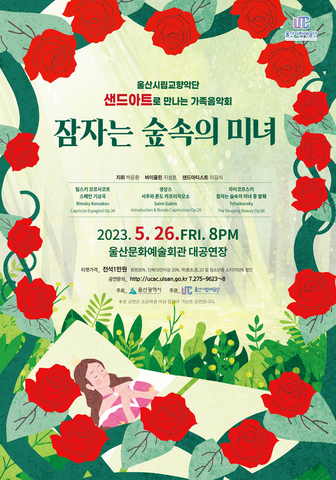 [경남도민뉴스] 울산시립교향악단이 5월 가정을 달을 맞아 샌드아트로 만나는 가족 음악회 ‘잠자는 숲속의 미녀’를 오는 5월 26일 오후 8시 울산문화예술회관 대공연장에서 개최한다.