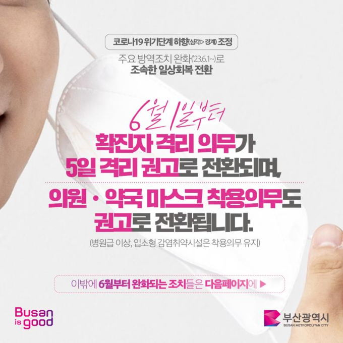 [경남도민뉴스]부산시(시장 박형준)는 오는 6월 1일부터 코로나19 감염병 재난 위기경보 단계가 ‘심각’에서 ‘경계’로 하향 조정됨에 따라 시민들의 안전한 일상 회복을 위한 대응계획을 수립하고 주요 방역 조치를 완화한다고 밝혔다.