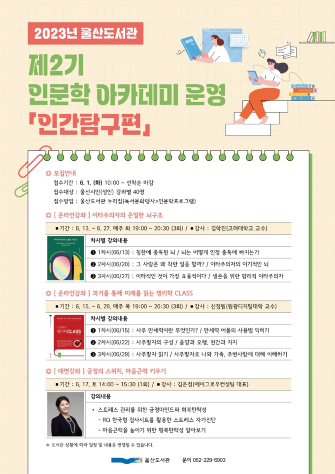 [경남도민뉴스] 울산도서관은 오는 6월 13일부터 6월 29일까지 ‘2023년 제2기 인문학 아카데미 인간 탐구편’ 강좌를 운영한다고 밝혔다.