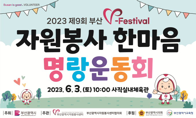 [경남도민뉴스] 부산시(시장 박형준)와 부산광역시자원봉사센터는 내일(3일) 오전 10시부터 부산사직실내체육관 주경기장에서 「2023 제9회 부산자원봉사축제(V-Festival), 자원봉사 한마음 명랑운동회」를 개최한다고 밝혔다.