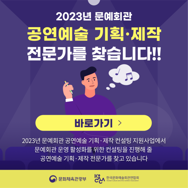 2023년 신규 추진되는 ‘문예회관 공연예술 기획·제작 컨설팅 지원 사업’은 문예회관 공연예술 활성화 및 자생력 제고를 목표로 문예회관에 공연예술 기획・제작 전문 컨설턴트를 파견하여 공연사업 전반을 컨설팅하는 사업이다.