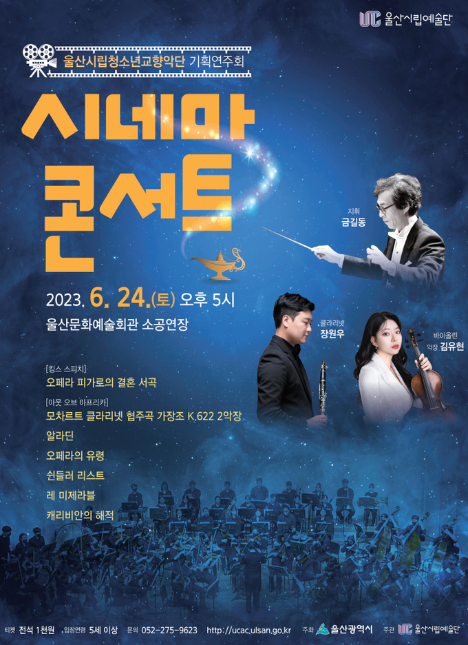 [경남도민뉴스] 울산시립청소년교향악단(지휘자 금길동)이 오는 6월 24일(토) 오후 5시 울산문화예술회관 소공연장에서 기획연주회 ‘영화(시네마) 콘서트’를 마련한다.