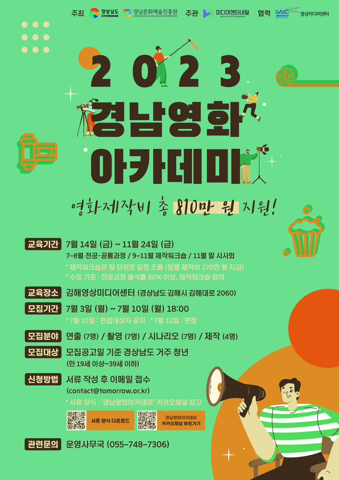 교육 수강을 원하는 청년은 카카오톡 채널 ‘경남영화아카데미’를 통해 수강신청 할 수 있으며, 관련 문의는 운영사무국(055-748-7306)으로 하면 된다.