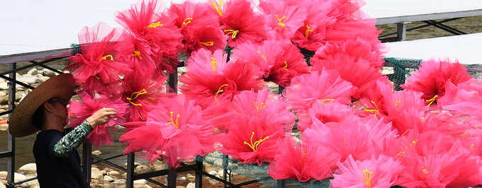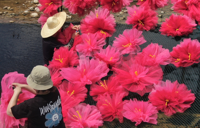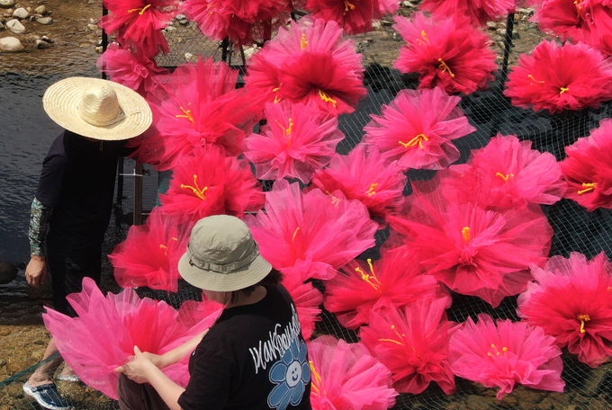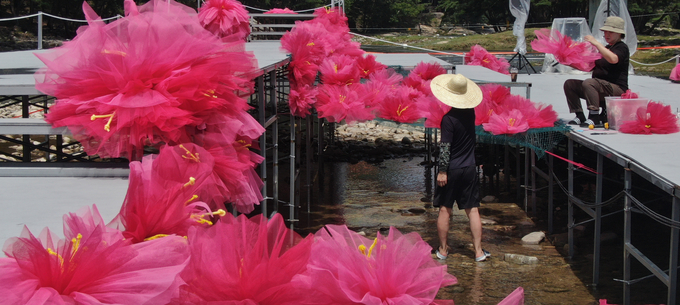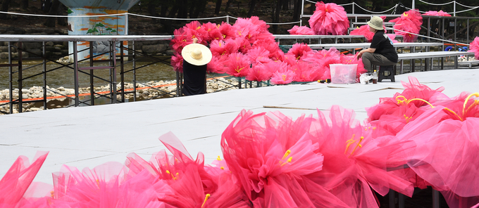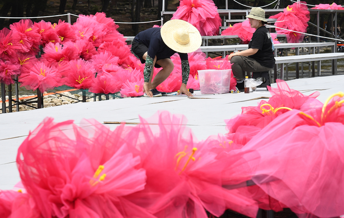 [경남도민뉴스] 제33회 거창국제연극제 개막을 하루 앞둔 27일 경남 거창군 위천면 수승대 수변 특설무대에서 개막작 공연을 위해 배롱나무를 연상케하는 붉은색 천으로 무대를 꾸미고 있다.