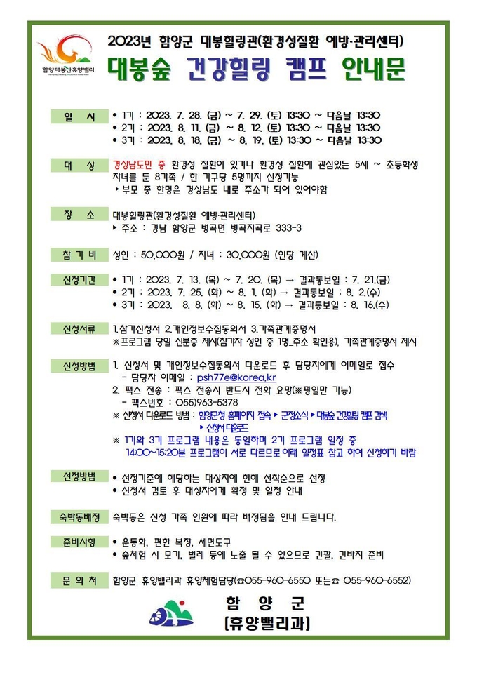 프로그램 관련 자세한 사항은 함양군청 누리집에 접속하여 군정소식 ▶대봉숲 건강힐링 캠프 검색 ▶ 안내문을 참고하여 신청서를 제출하면 된다.