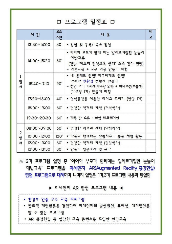 캠프에서는 아이 눈높이에 맞춘 알레르기질환 예방에 대한 교육과 애니메이션을 시작으로 아로마 친환경 생활제로 천연모기기피제와 바디로션 보습제 만들기. 가족 모두 각자 좋아하는 도안을 선택하여 가족 티셔츠 꾸미기 등 화합의 시간을 가졌다.