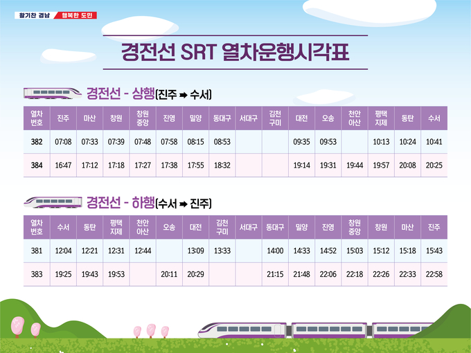[경남도민뉴스] 경남도(도지사 박완수)는 도내 철도이용객의 교통편익 증진을 위한 방편으로 경전선 수서행 고속철도 운행을 지속적으로 국토교통부(이하 “국토부”) 건의한 결과 내달 1일부터 운행을 시작한다고 밝혔다.