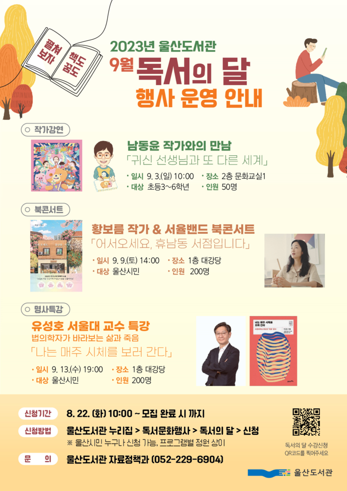 9월 독서의 달 행사는 8월 22일 오전 10시부터 울산도서관 누리집(library.ulsan.go.kr)을 통해 신청할 수 있다.