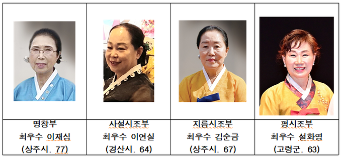 명창부 장원 수상자인 이재심(77. 상주시) 명인은 “작년과 올해 근 2년 동안 코로나와 독감, 폐렴 등을 앓다보니 기력이 떨어지고 총기가 흐려져 악보를 볼 엄두가 나지 않을 만큼 정신을 못 차리다가 아이고 이래서는 안 되겠다. 시조창을 하면서 나를 회복해야겠다 싶어서 시조창을 시작했는데, 이번 함안전국대회에서 최우수상을 받게 되어 정말로 기뻐요” 라며 수상소감을 밝혔다.