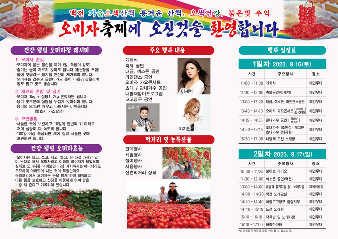 백전면 박윤호 면장은 “백전오미자는 백두대간 자락 고랭지에서 자라 맛과 영양이 풍부해 전국 소비자의 큰 인기를 끌고 있다”며 “이번 오미자축제에 남녀노소 누구나 찾아와 오색찬란 오미자를 다양하게 체험하며 즐거운 추억을 만들기 바란다.”고 말했다.