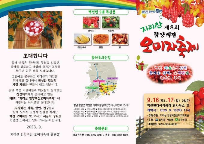 [경남도민뉴스] 함양군은 오는 9월 16일과 17일 백전면사무소 앞 다목적광장에서 ‘제8회 지리산함양 백전오미자축제’를 개최한다고 밝혔다.