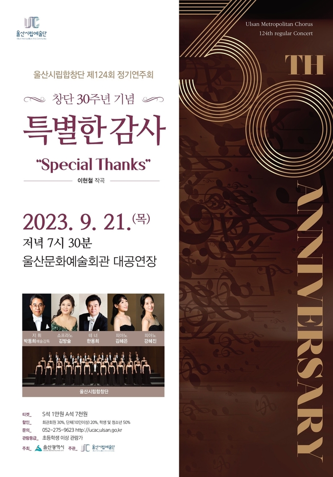 [경남도민뉴스] 울산시립합창단(지휘 박동희)이 창단 30주년을 기념하여 9월 21일(목) 오후 7시 30분 울산문화예술회관 대공연장에서 제124회 정기연주회 ‘창단 30주년 기념 - 특별한 감사’를 마련한다.