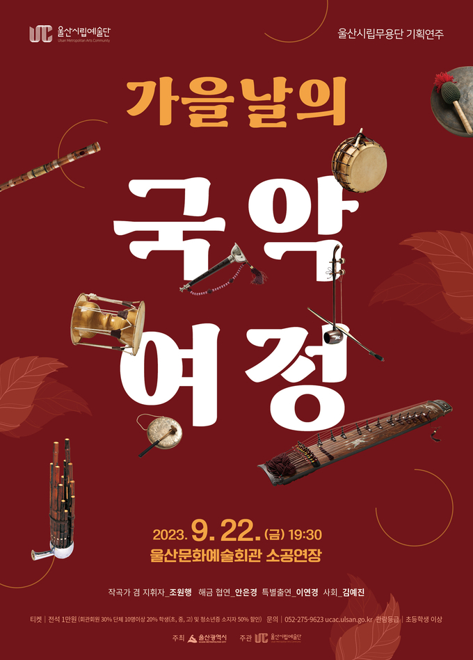 [경남도민뉴스] 울산시립무용단 국악 연주팀의 기획공연 ‘가을날의 국악여정’이 오는 9월 22일 오후 7시 30분 울산문화예술회관 소공연장에서 펼쳐진다.