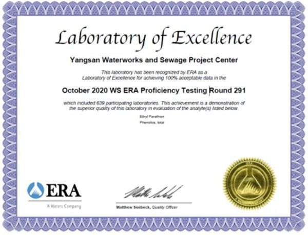 [경남도민뉴스] 양산시 상하수도사업소 『먹는물 수질검사기관』은 지난 10월 국제공인시험기관 미국 환경자원협회 ERA와 독일 MERK에서 주관하는 먹는물 분야 국제숙련도 시험에 참가하여 국제공인 인증서를 획득했다고 밝혔다.