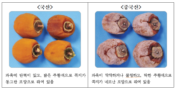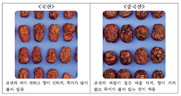 ① [대추] 국산은 표면의 색이 연하고 향이 진하면서 꼭지가 많이 붙어 있으며, 중국산은 표면이 짙은 색을 띠면서 향이 거의 없고 꼭지가 붙어 있는 것이 대체로 적다.