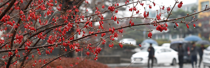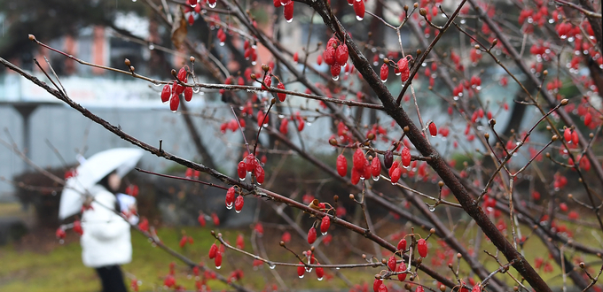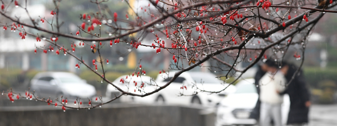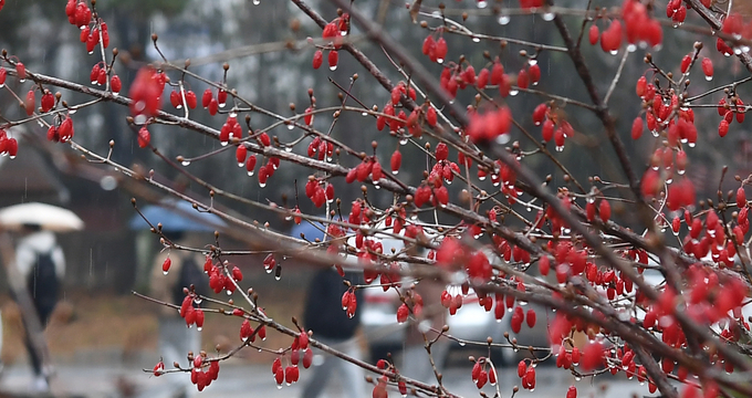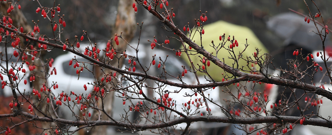 [경남도민뉴스] 겨울비가 내리는 14일 경남 거창군 거창읍 경남도립거창대학 캠퍼스의 산수유 열매에 빗방울이 매달려 있다.