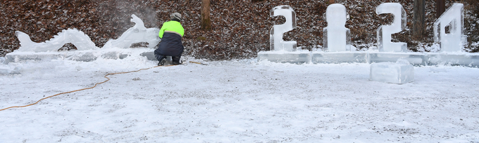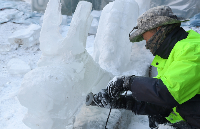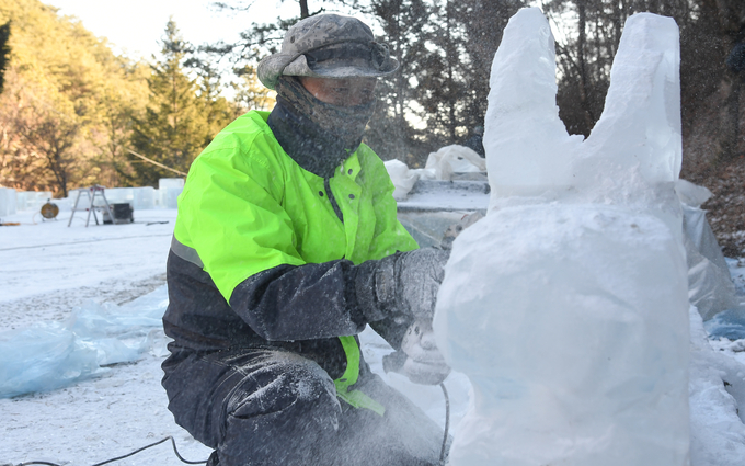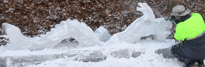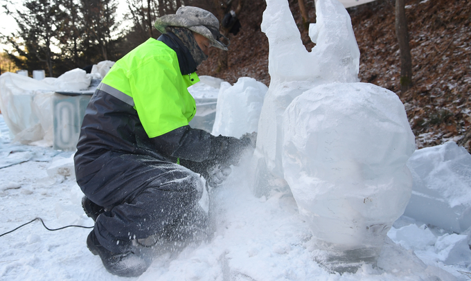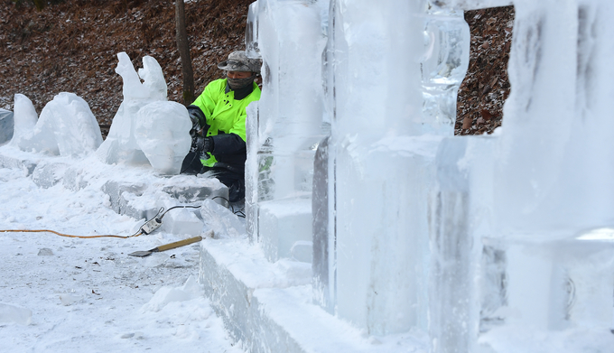 [경남도민뉴스] 소한을 이틀 앞둔 4일 경남 거창군 위천면 금원산자연휴양림 얼음조각 전시장에서 관계자들이 얼음 축제를 준비하고 있다.