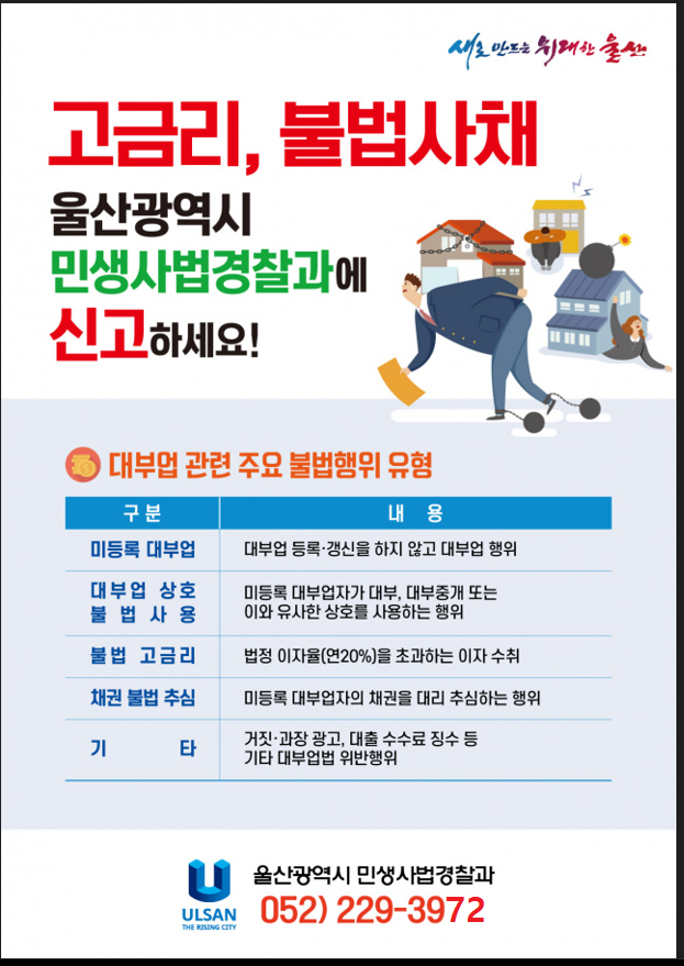 울산시 관계자는 “불법 사채를 사용해 어려움을 겪고 있다면 울산시 민생사법경찰과(☎ 052-229-3973)로 전화하여 법률상담, 무료 변호인 선임 등 도움을 받을 것을 적극 권한다.”라며 “시민들의 어려운 사정을 악용하는 불법 사채 예방을 위해 시민들의 많은 제보를 당부드린다.”라고 말했다.